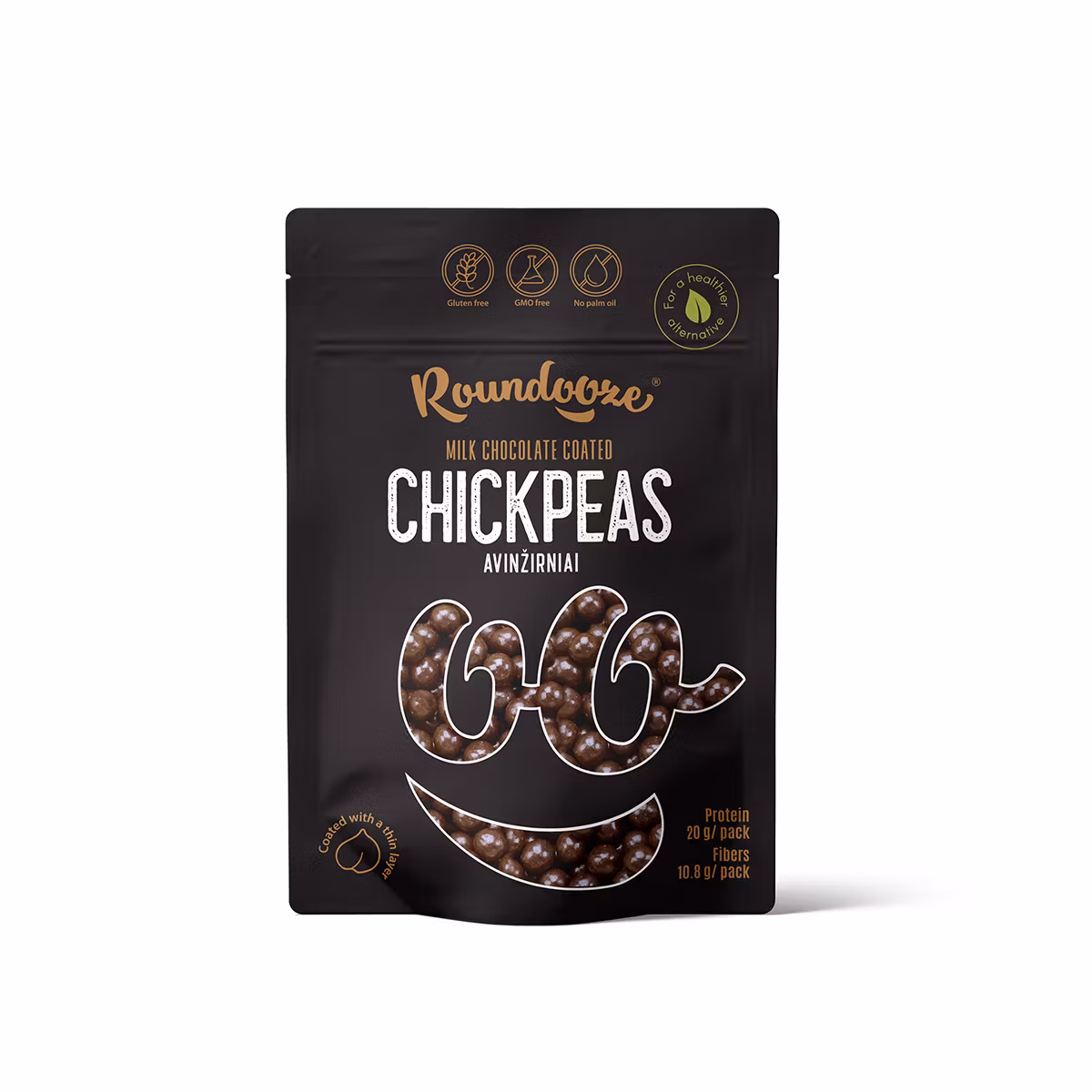 Dubbelrostade kikärtor täckta av högkvalitativ mjölkchoklad, vilket ger den krispiga kikärtan en mild och söt chokladsmak.